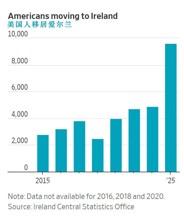 其中,葡萄牙自疫情以来美国人数量暴增;西班牙、荷兰这些地方十年里都出现了翻番;德国、爱尔兰2025年美国人移入甚至超过了本国人移出;爱尔兰2025年预计能到1万人,几乎是2024年的两倍。
