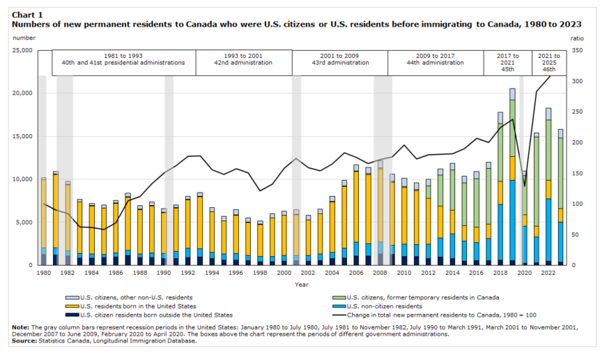 但加拿大统计局的数据并不支持。2025年前三季度,美国人拿到加拿大永久居民资格的人数,同比反而减少了20%,是疫情以来的低位。到2026年1月,人数更是只有295人,去年同期是805人。